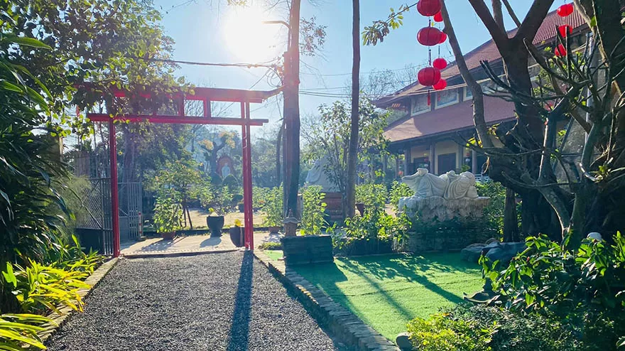 Chùa Long Hoa đẹp và yên tĩnh, có khu vườn với hơn 30 tượng Phật Di Lặc, mỗi tượng mỗi tư thế nụ cười khác nhau, với cách bố trí thập diện mai phục, bất cứ góc nào chúng ta cũng thấy được nụ cười hoan hỷ, vui vẻ của Ngài. Không thể không nhắc đến Khu vườn được thiết kế theo phong cách Nhật Bản, có cổng trời, vườn hoa anh đào và hồ c á Koi tuyệt đẹp.
