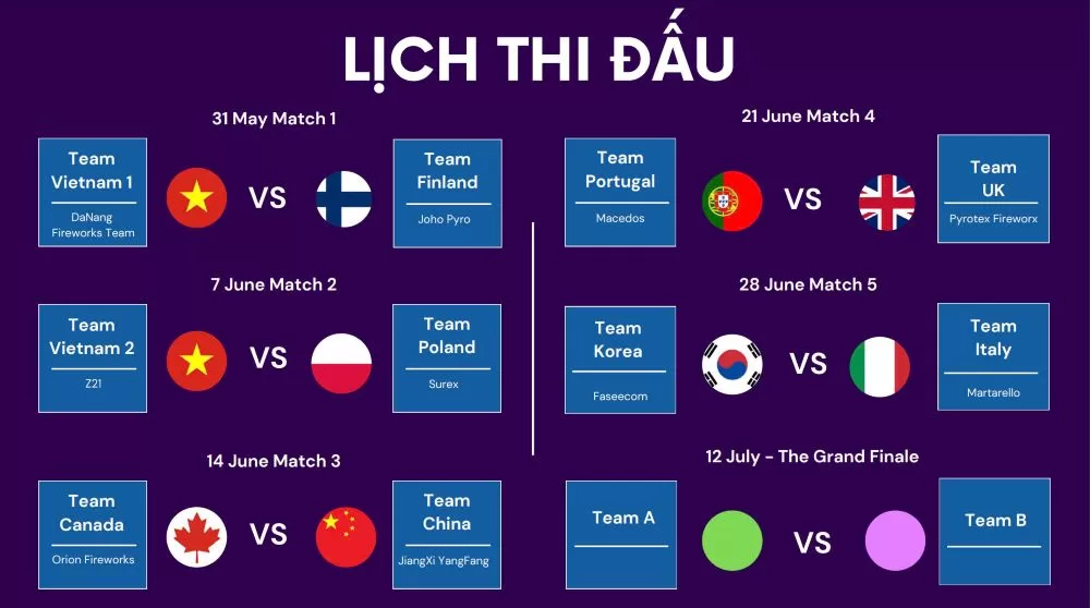 Đêm khai mạc dự kiến diễn ra vào ngày 31/5, với trận đấu giữa hai đội Việt Nam 1 và Phần Lan, mang chủ đề “Tinh hoa văn hóa”. Các đêm pháo hoa tiếp theo sẽ diễn ra vào mỗi tối thứ Bảy, với các chủ đề đa dạng như Nghệ thuật sáng tạo, Hành trình kết nối, Phát triển bền vững, Công nghệ dẫn lối và Đón kỷ nguyên mới.